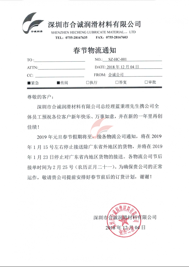 深圳市合誠(chéng)潤(rùn)滑材料有限公司總經(jīng)理藍(lán)秉理先生攜公司全體員工預(yù)祝各位客戶(hù)新年快樂(lè)、萬(wàn)事如意,并在新的一年里再創(chuàng)佳績(jī)!